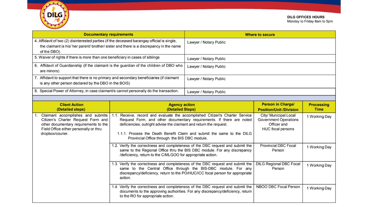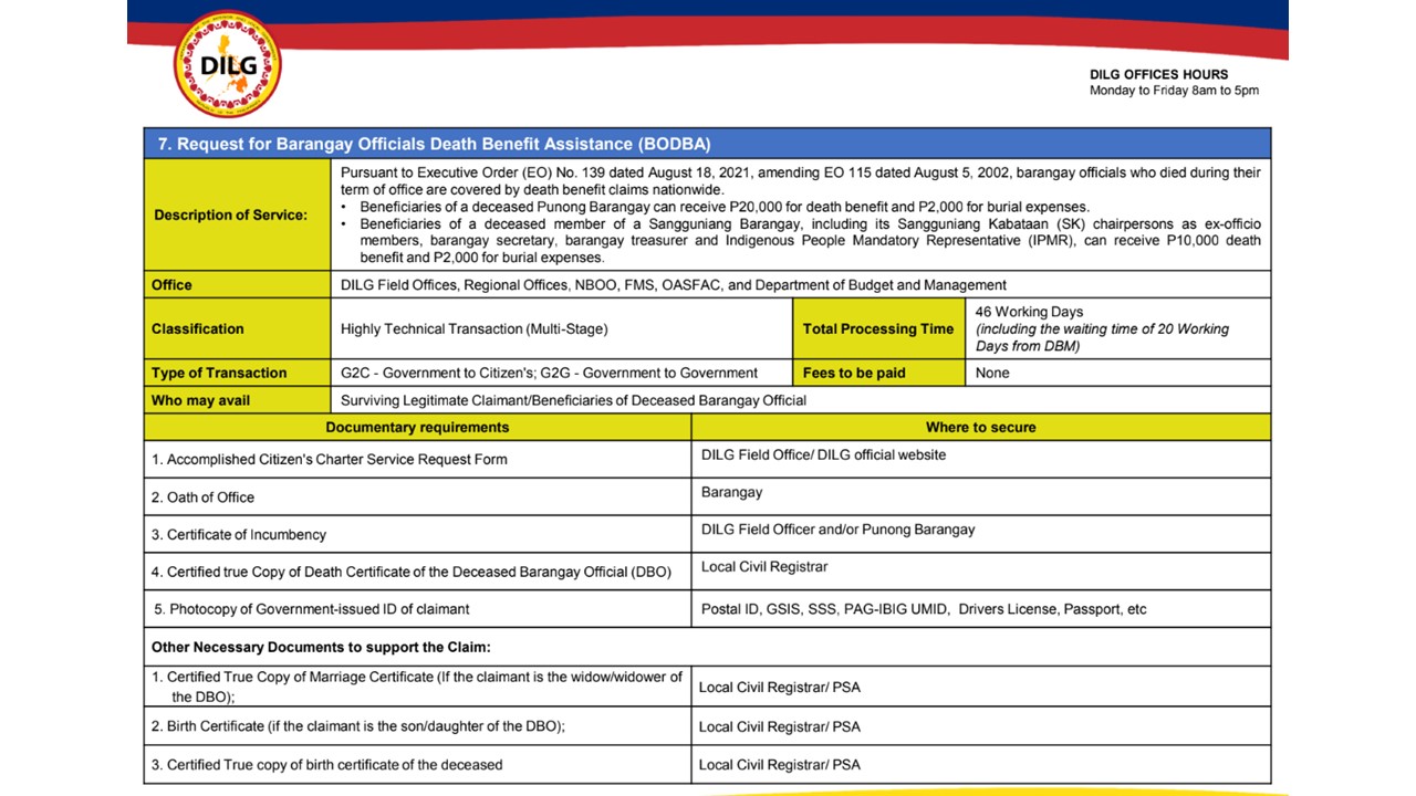 - Who may avail?: Surviving legitimate claimant/Beneficiaries of Decease Barangay Official
